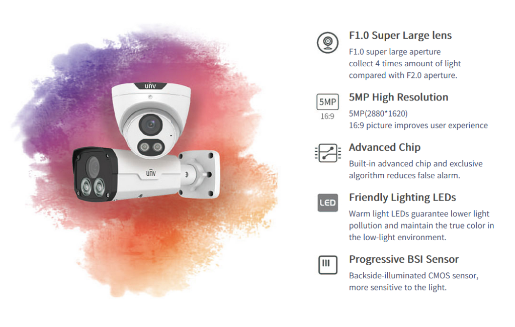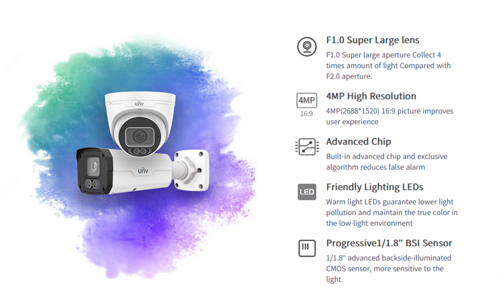 La puissante capacité de la caméra UNV ColorHunter à capturer des détails colorés dans l’ultra-faible luminosité provient de trois avancées majeures dans le matériel : une très grande ouverture, un capteur BSI progressif et des LED d’éclairage conviviales.