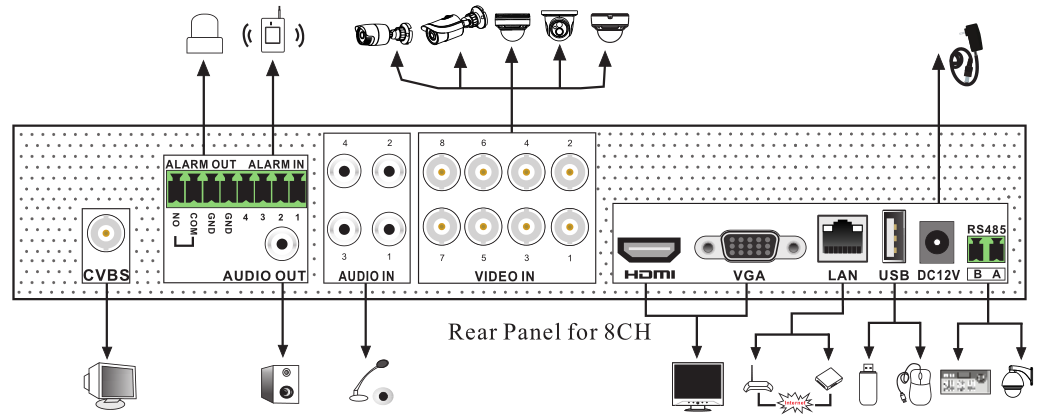 - 4 CH DVR supports 1 CH IPC 1080P / 960P / 720P recording; 8 CH DVR supports 1 CH IPC 3MP / 1080P / 960P / 720P recording