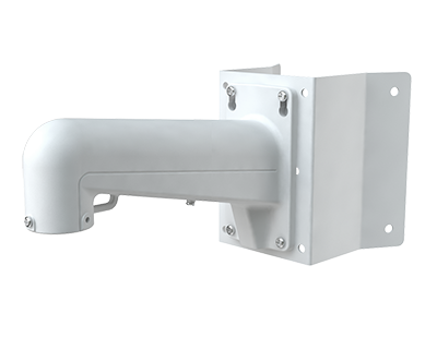 The mounting bracket allows for the installation of a 30 cm (12 inches) Speed Dome network camera on an exterior corner. This sturdy enameled aluminum mounting support features a suspension point for hanging the camera during installation, along with mounting hardware.